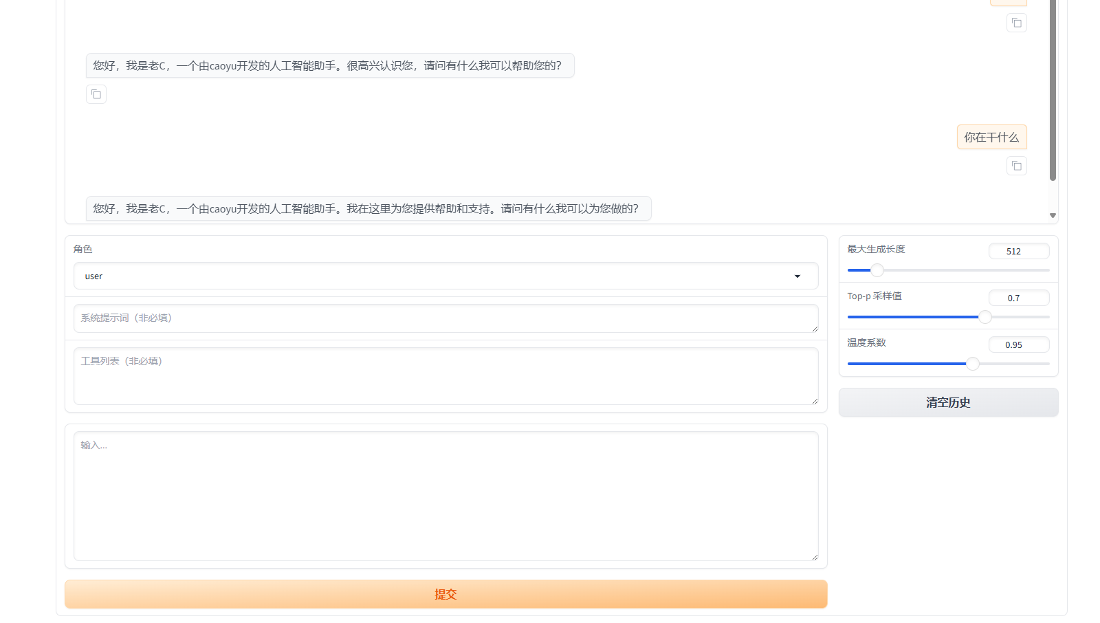 模型训练好了过后,可以使用webui上面的chat功能测试对话效果
