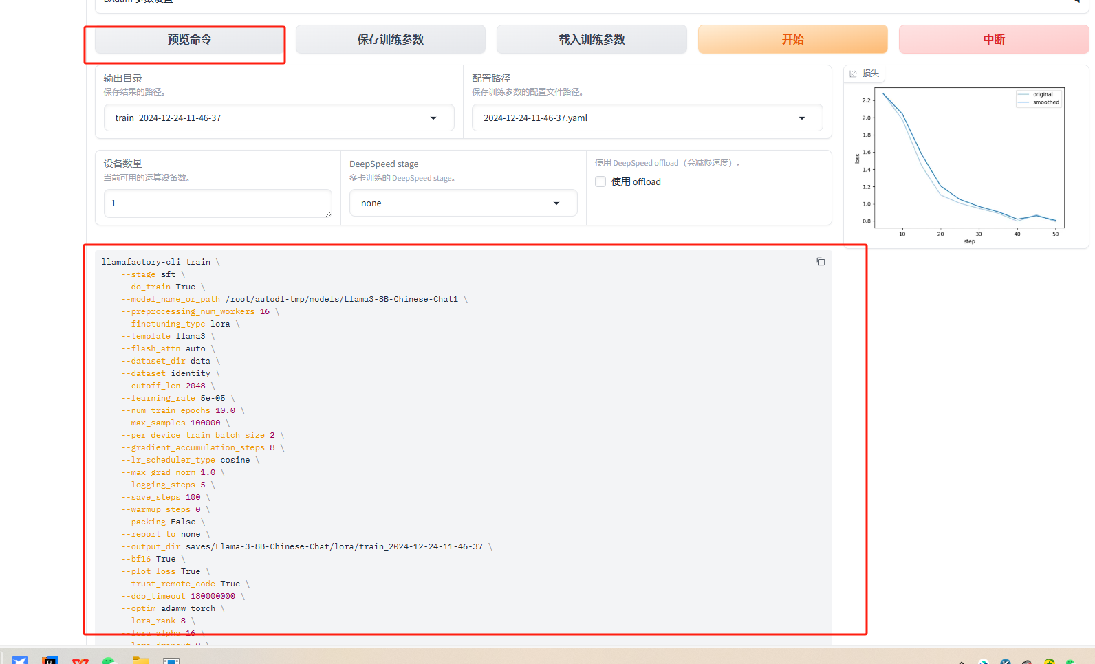 第一种是在webui上面设置好了参数,在下面点击预览命令,直接复制到命令行中运行