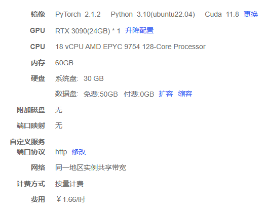 由于没钱买显卡,所以在这里我使用AutoDL平台租用的一个3090ti 24G显卡,具体配置如下图