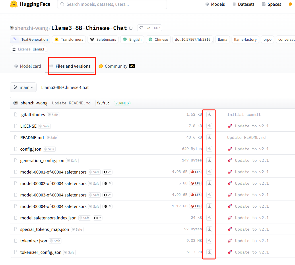 下载模型我们可以进入huggingface然后搜索自己需要下载的模型,然后点击file吧里面的文件挨个下载下来后,放在同一个文件夹下。