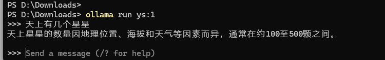 导入完成过后执行以下命令可以进入大模型,并且测试。需要改为自己的名字和版本